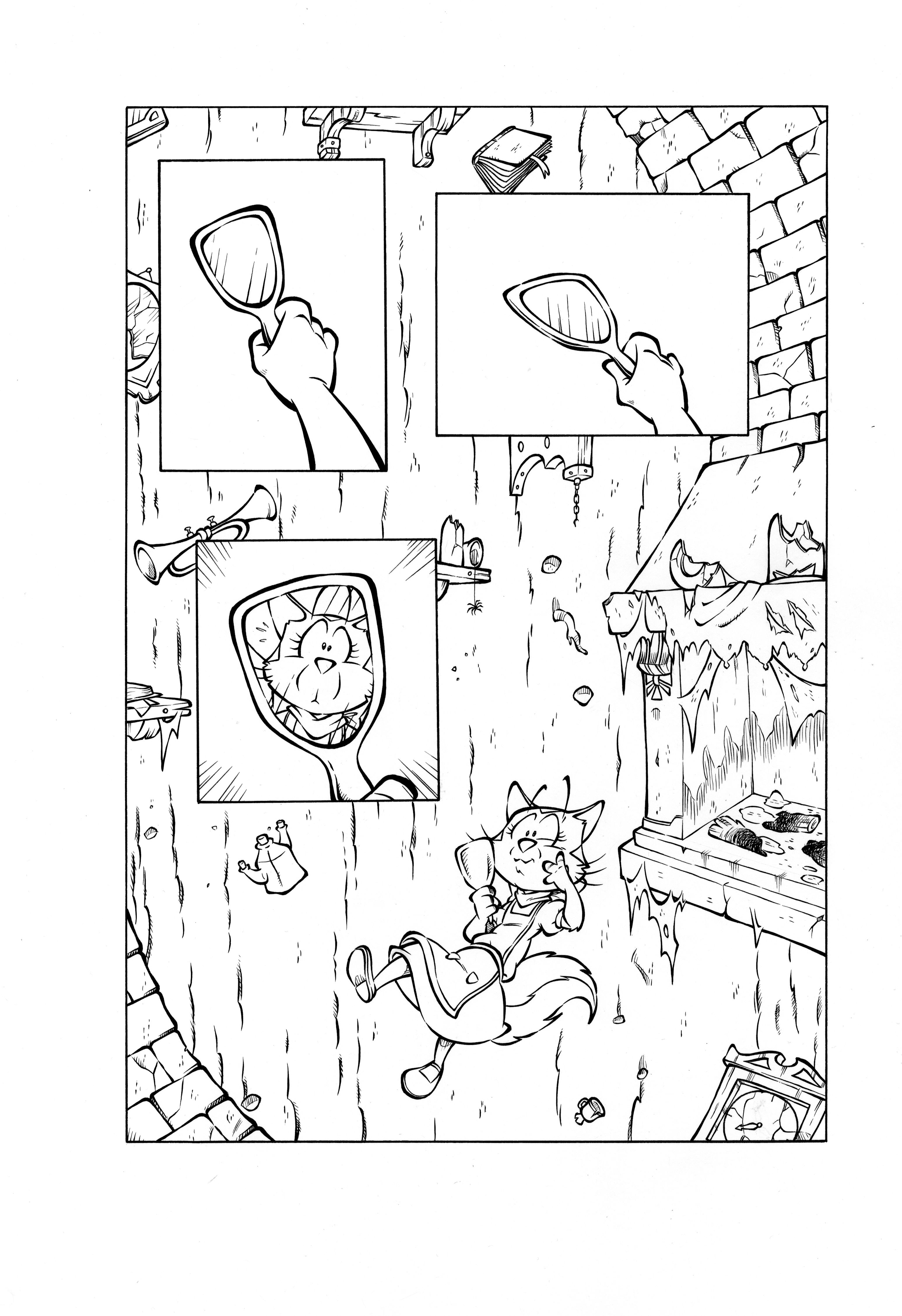 Infine nelle tavole conclusive, lo stile sarà disneyano con una gabbia molto ordinata, per ritornare al finale del film della Disney (e ovviamente del libro di Carroll), nel momento del risveglio dall’incubo, e quindi ricollegarci a quelle atmosfere.