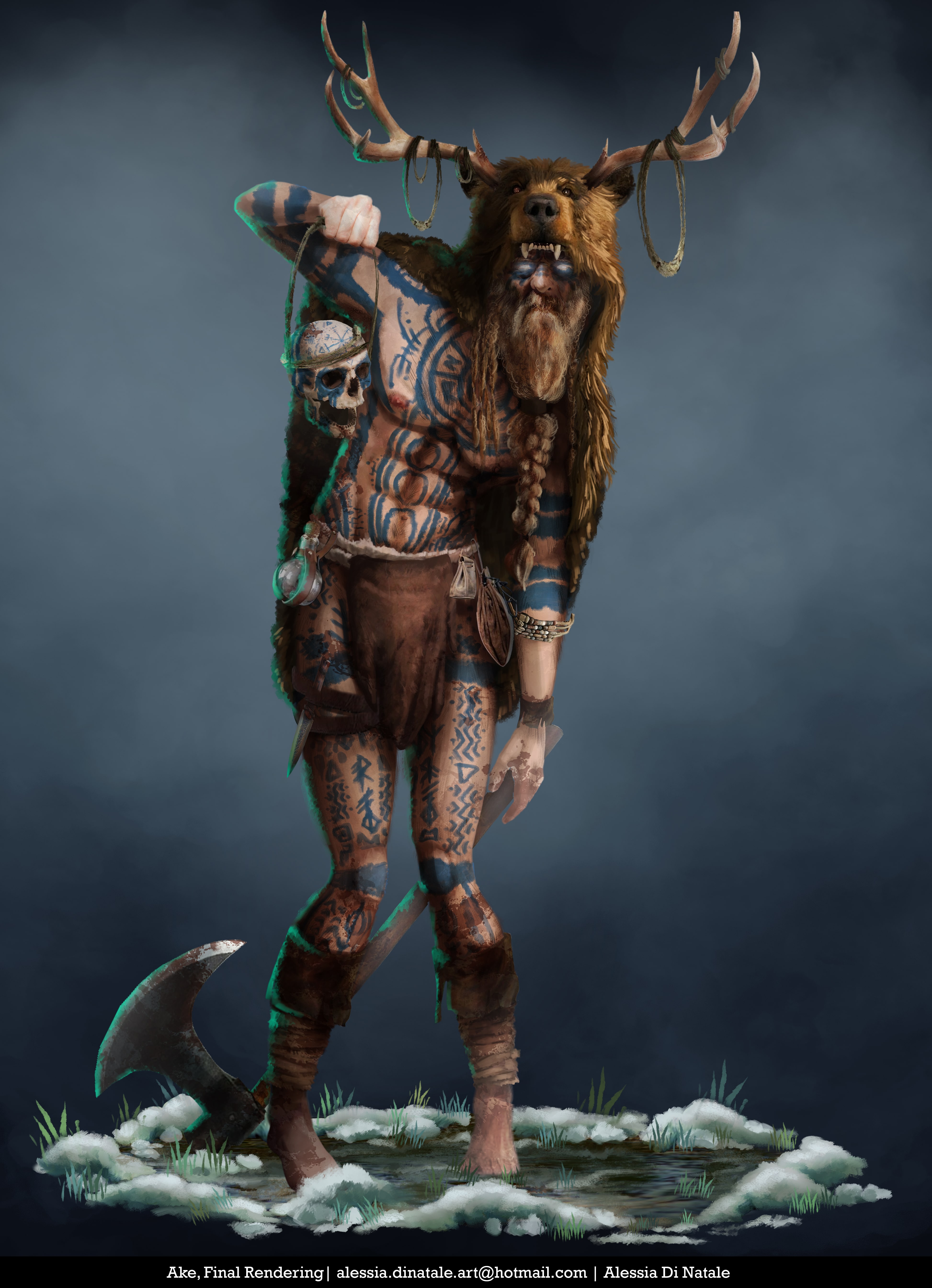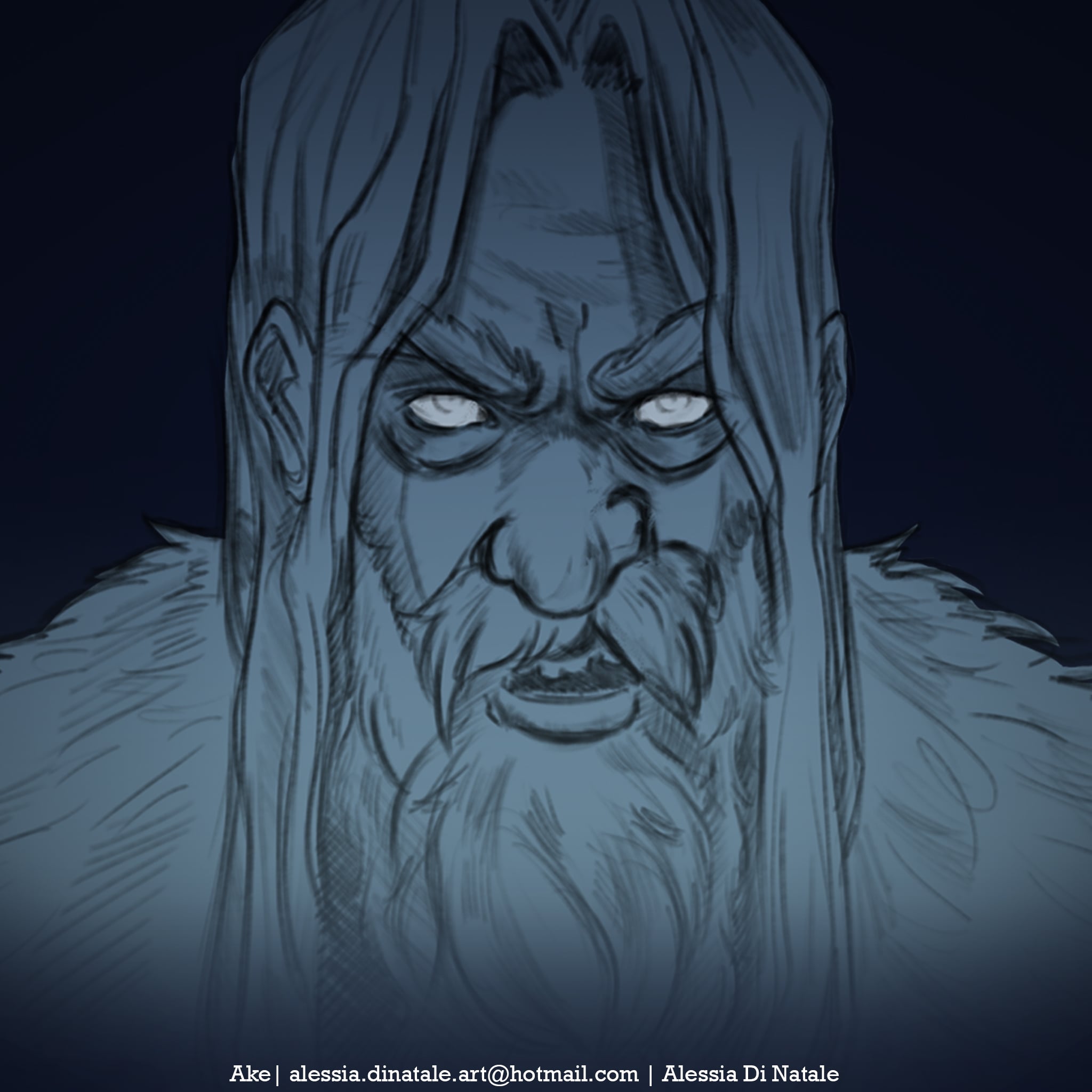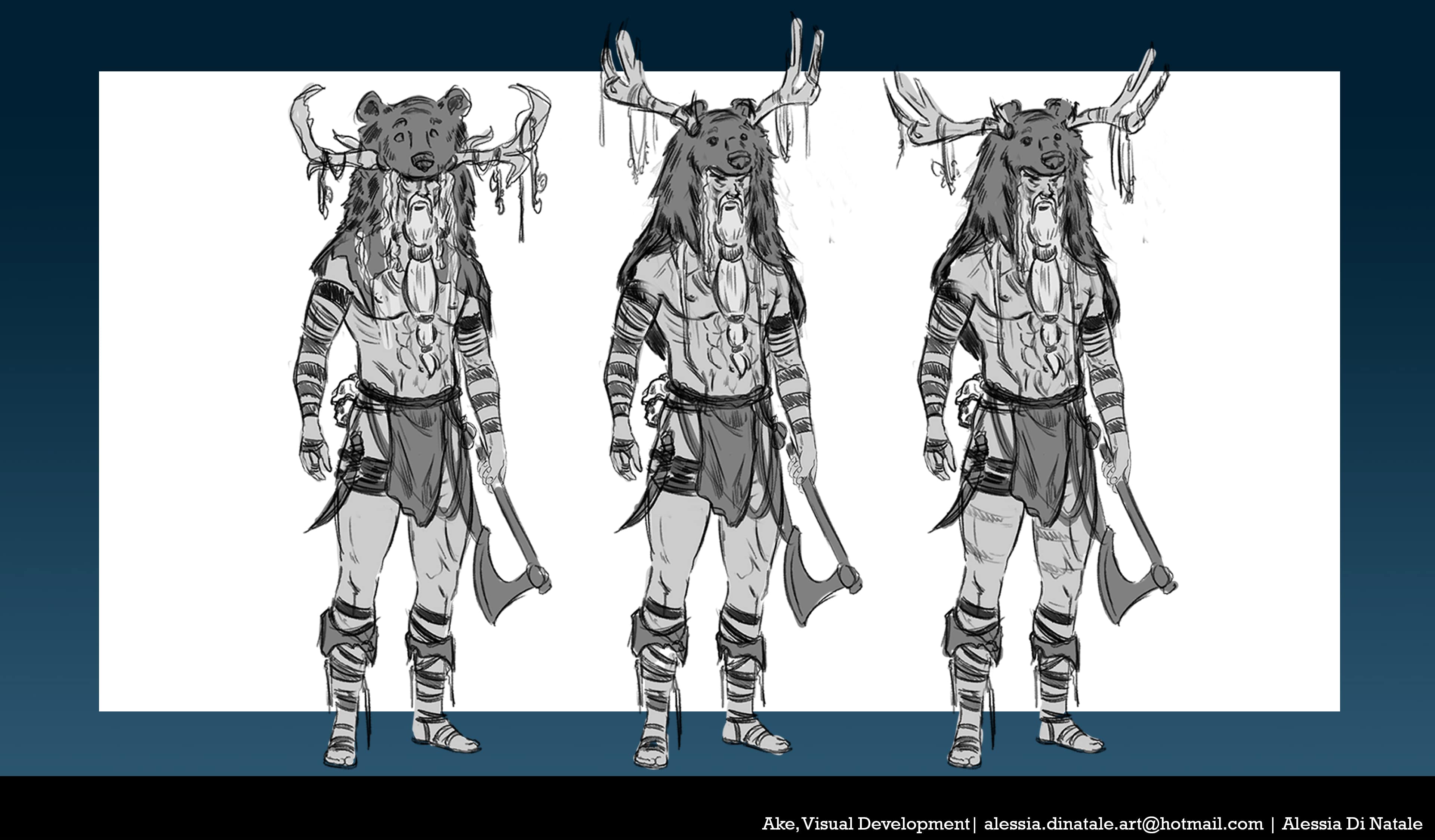 Ake, personaggio secondario, si prende cura della protagonista Eyre, abbandonata nella foresta quando era ancora in fasce perché maledetta dagli dei (vedi concept nel portfolio).