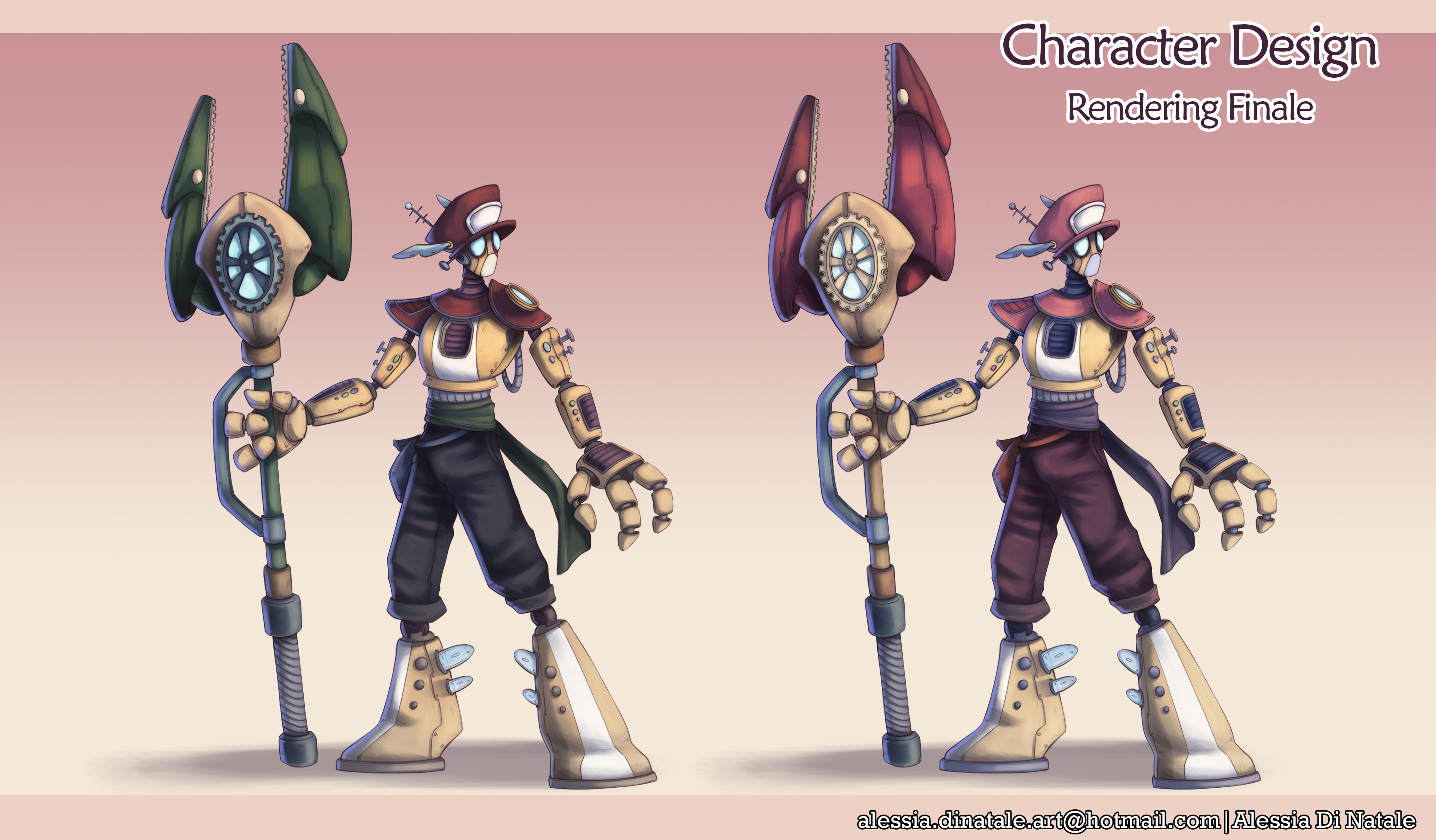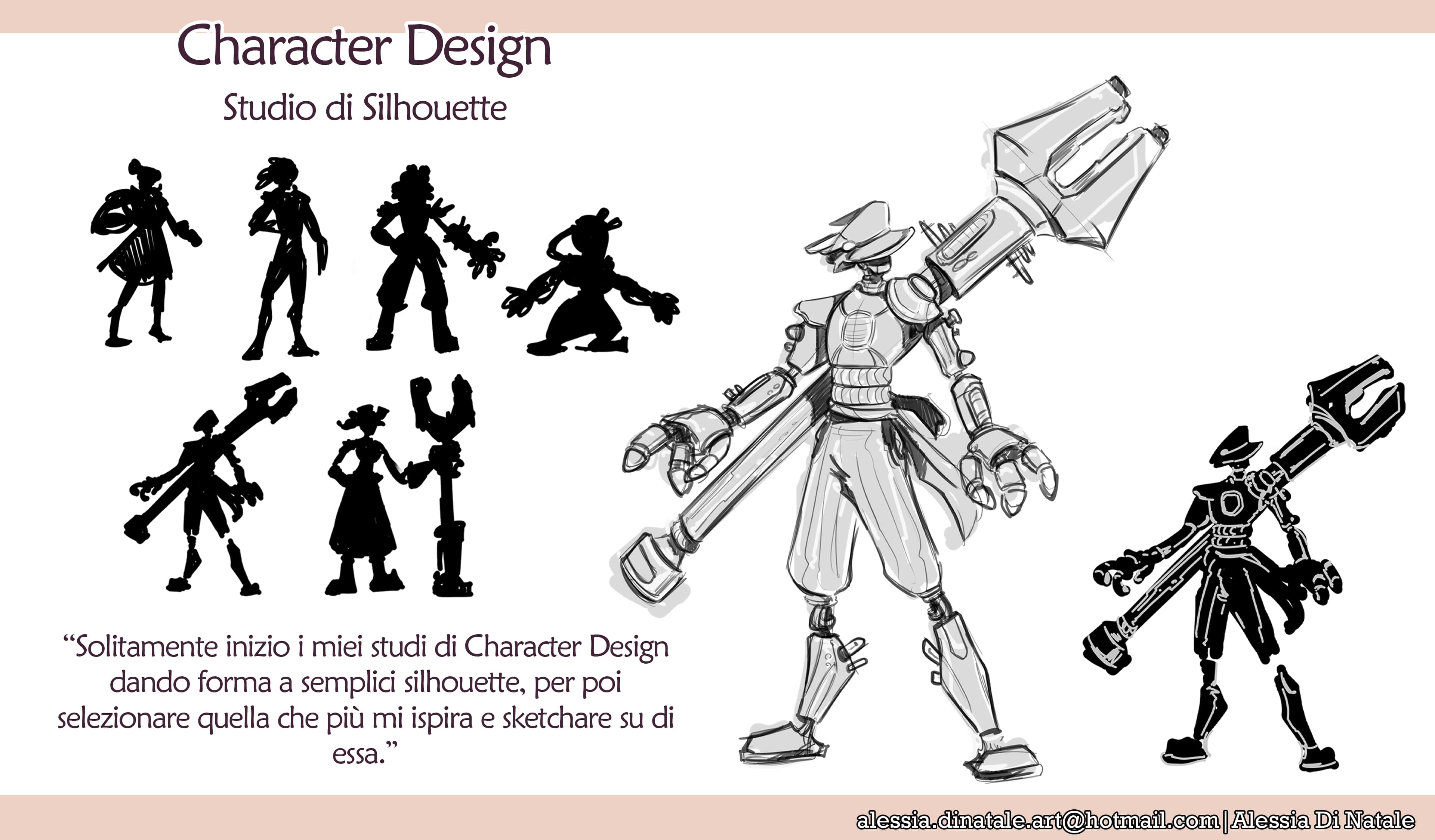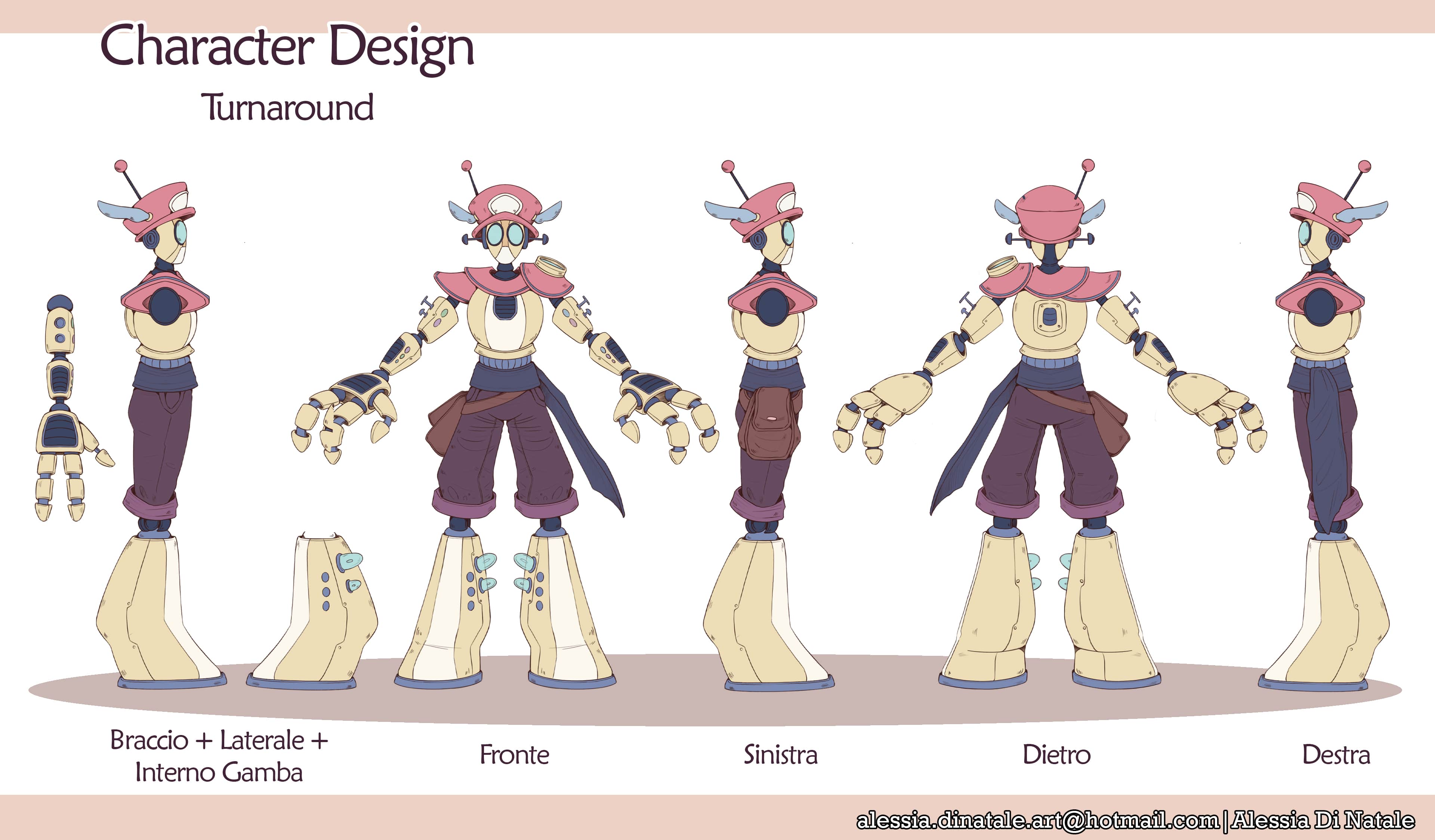 Studio di Character Design che ho realizzato come esercizio personale, completo di Shape Design, Rendering e Turnaround adatto alla modellazione 3D del personaggio.