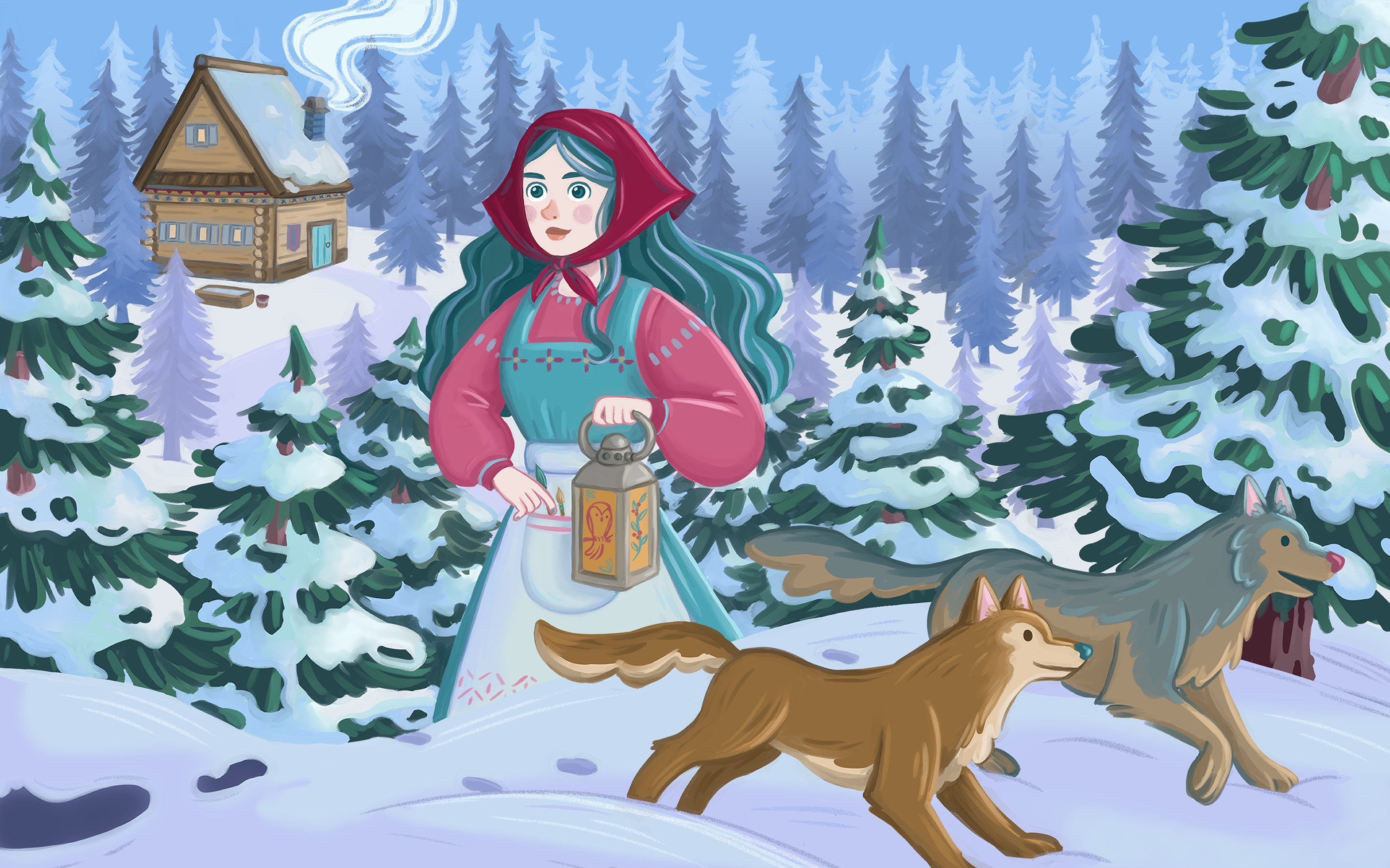 Illustrazione basata sul testo "La ragazza dei lupi", preso dal manuale di scolastica "Il cerchio dei lettori" (Raffaello Scuola).