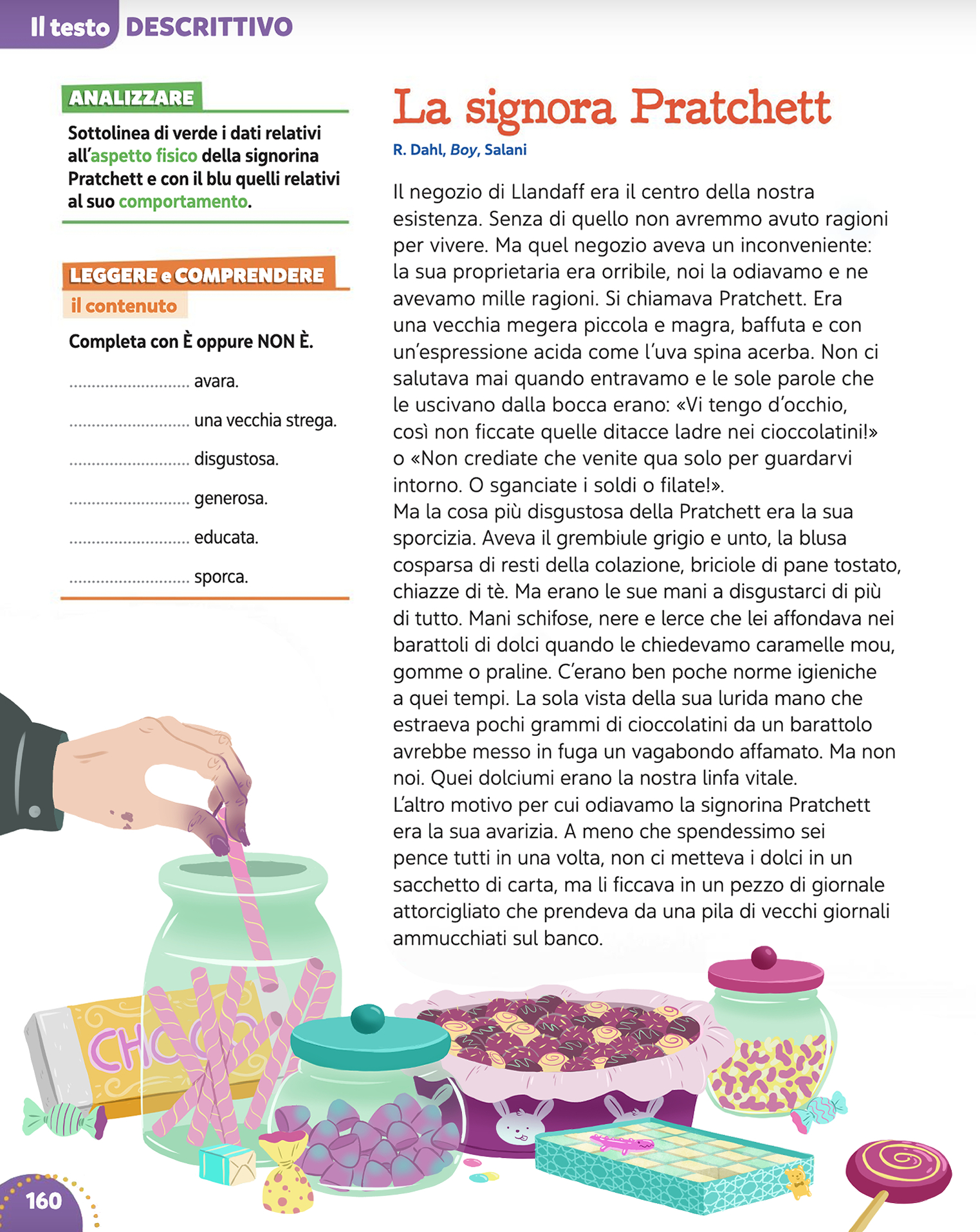 Illustrazione basata sul testo "LA signora Pratchett", preso dal manuale di scolastica "Il cerchio dei lettori" (Raffaello Scuola).